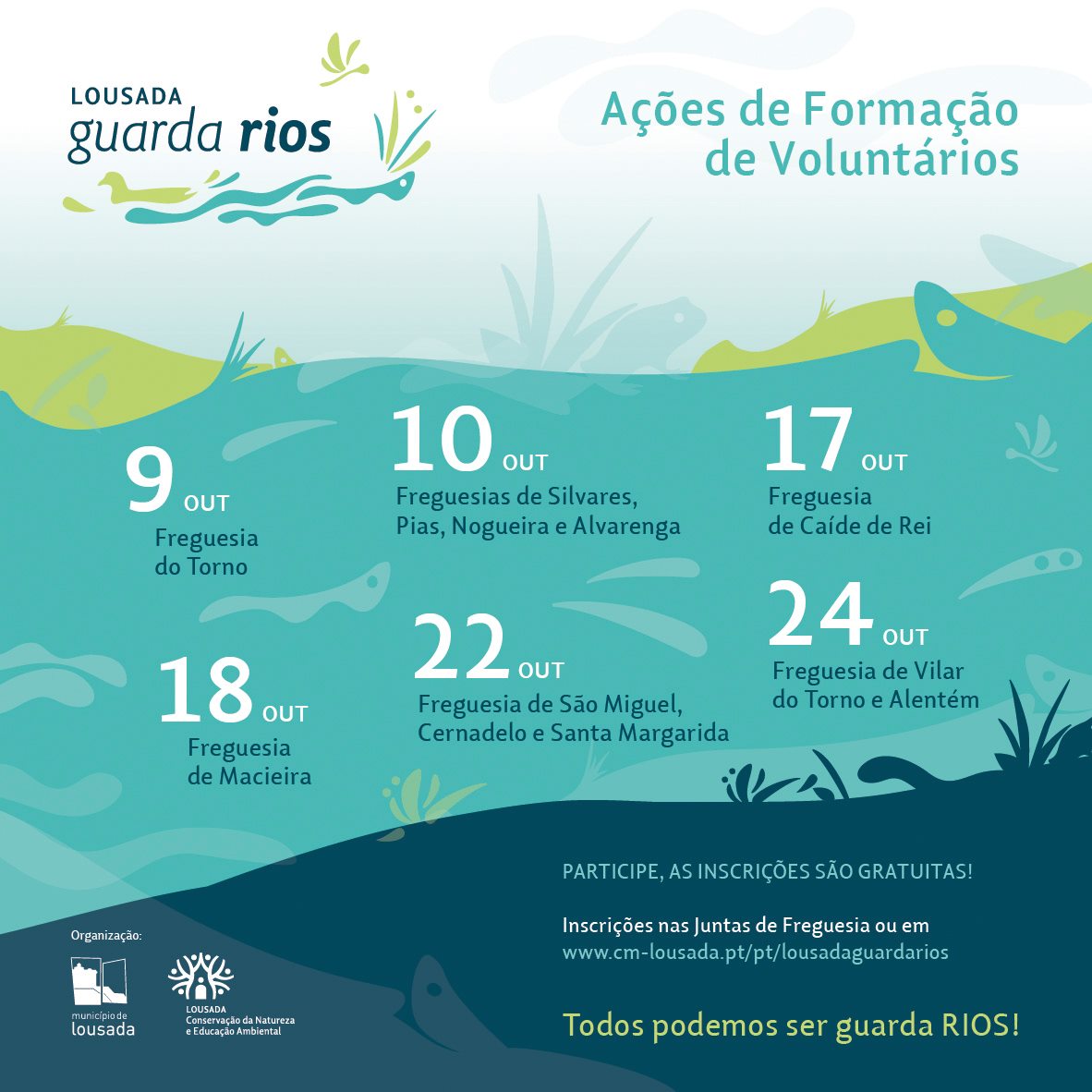Todos os interessados em colaborar neste projeto têm agora oportunidade de receber formação específica, de forma gratuita e em proximidade. Numa primeira fase, já durante o mês de outubro, serão 6 as formações disponíveis, nas Juntas de Freguesia de Torno; Silvares, Pias, Nogueira e Alvarenga; Caíde de Rei; Macieira; São Miguel, Cernadelo e Santa Margarida; e Vilar do Torno e Alentém.