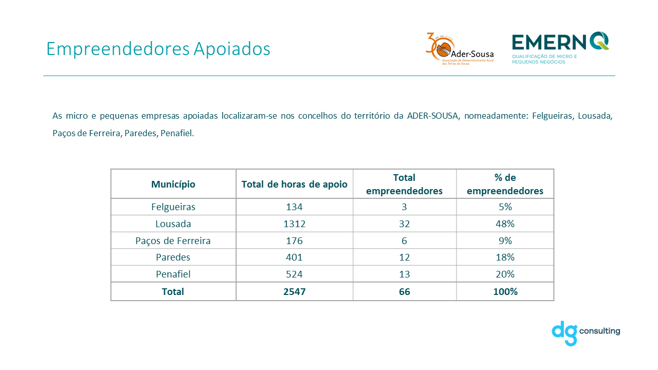 Dos 66 empreendedores apoiados, 23% participaram na 1º Edição do EMERN, o que demonstra que os empresários das Terras do Sousa necessitam e reconhecem a importância deste apoio (consultoria / qualificação) às suas empresas / negócios.