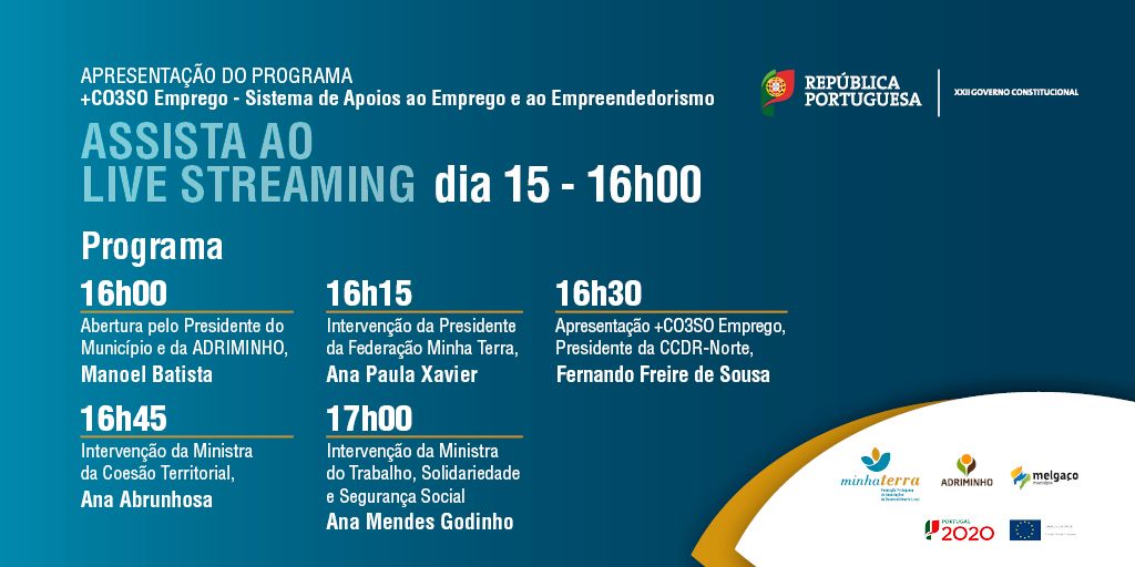 Após as boas vindas pelo Presidente da Câmara Municipal de Melgaço e da associação ADRIMINHO, Manoel Batista, seguem-se intervenções de Ana Paula Xavier, Presidente da Federação Minha Terra e Fernando Freire de Sousa, Presidente da CCDR Norte e da Comissão Directiva do Norte 2020, que fará a apresentação do programa +CO3SO Emprego. Terão posteriormente lugar intervenções por parte de Ana Abrunhosa, Ministra da Coesão Territorial e de Ana Mendes Godinho, Ministra do Trabalho, Solidariedade e Segurança Social.