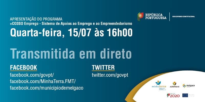 Decorre no próximo dia 15 de julho, em Melgaço, a sessão de apresentação do programa +CO3SO Emprego, o novo sistema de apoios ao emprego e ao empreendedorismo, numa organização da Federação Minha Terra e do Ministério da Coesão Territorial, com o apoio da ADRIMINHO e do Município de Melgaço.