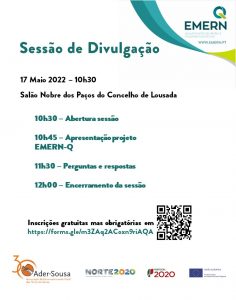 No âmbito do projeto EMERN-Q vai ser realizada pela Ader-Sousa uma sessão de divulgação com vista a promover o projeto, divulgar boas práticas e promover iniciativas de cooperação. A sessão realiza-se no dia 17 de Maio de 2022, em Lousada da parte da manhã.