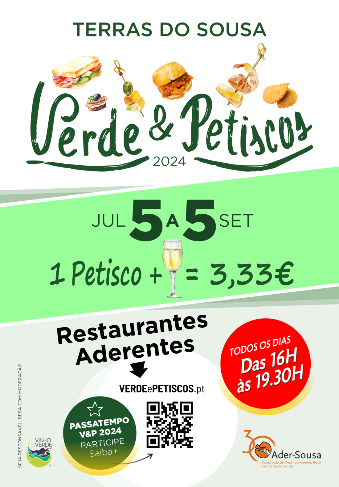 O Verde & Petiscos é uma iniciativa da ADER-SOUSA – Associação de Desenvolvimento Rural das Terras do Sousa e tem como objetivo dinamizar os sectores da restauração e do vinho verde, das Terras do Sousa (Felgueiras, Lousada, Paços de Ferreira, Paredes e Penafiel). O evento vai decorrer até 05 de setembro e conta já com a terceira edição.