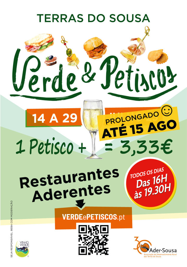 Relembrar que estão associados ao Verde & Petiscos 15 estabelecimentos do setor da restauração, localizados nos concelhos de Felgueiras, Lousada, Paços de Ferreira, Paredes e Penafiel, onde poderá desfrutar de um menu especial composto por um copo de vinho verde e um petisco com sabor das Terras do Sousa, por apenas 3,33€. Cada um dos espaços aderentes serve este “menu especial” todos os dias, no período das 16.00h às 19.30h.
