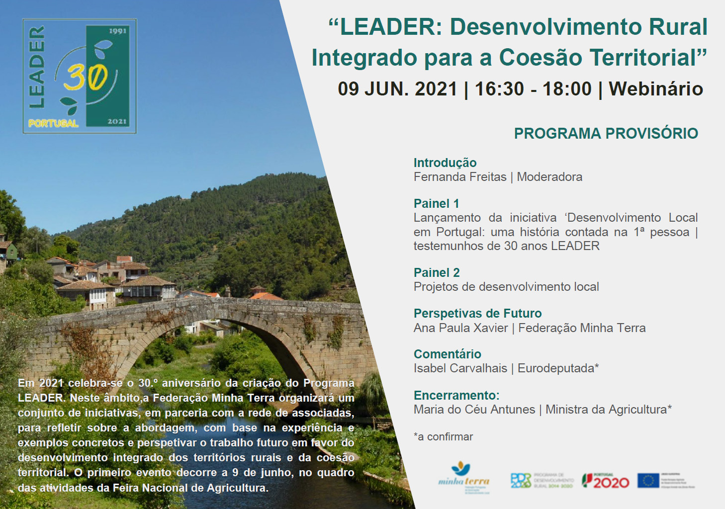 Em 2021 celebra-se o 30.º aniversário da criação do Programa LEADER. Neste âmbito, a Federação Minha Terra organizará um conjunto de iniciativas, em parceria com a rede de associadas, para refletir sobre a abordagem, com base na experiência e exemplos concretos e perspetivar o trabalho futuro em favor do desenvolvimento integrado dos territórios rurais e da coesão territorial. O primeiro evento decorre a 9 de junho, no quadro das atividades da Feira Nacional de Agricultura, em formato de webinário (em streaming).